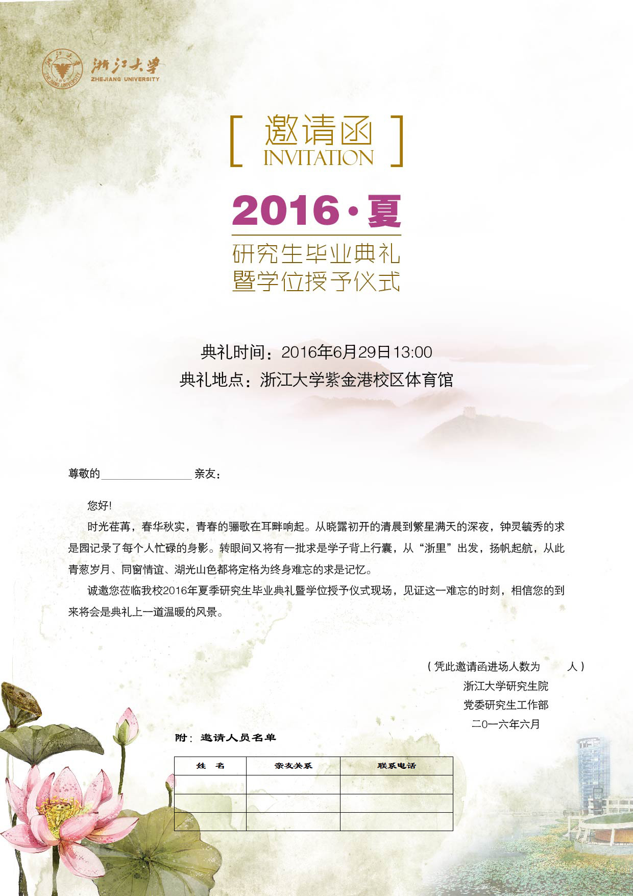 9.欢迎学位获得者导师及亲友参加学位授予仪式,请按指定区域就坐,导师、亲友凭邀请函入场,导师邀请函请院系于6月27日筹备会当天现场领取;亲友邀请函须加盖院系公章方为有效,亲友邀请函格式见附件3(说明:一张邀请函限一户家庭,需注明人数,凭函入内)。