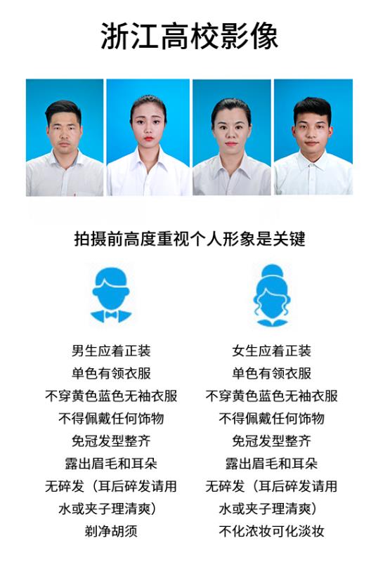 5. 请按影像拍摄要求免冠、着正装,保持服装整齐、仪容仪表整洁端庄;为免影响图像效果,不宜穿着黄色衣服。