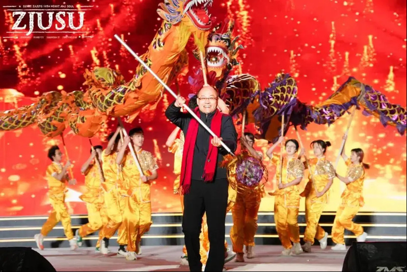 A highlight of the gala came with President Ma Yanming joining ZJU's dragon and lion dance team to stage the stunning performance Two Dragons Celebrate the New Year, Blessings Fill the Campus. To the stirring drumbeats, two golden dragons twisted and leaped dynamically, their vivid movements embodying the sincere wishes for Zhejiang University to forge ahead and gallop on a new journey in the coming year, with every stride brimming with vitality and hope for greater achievements.
